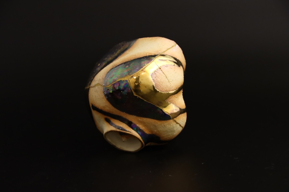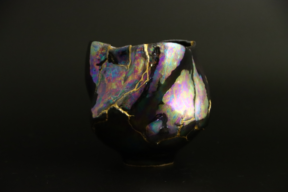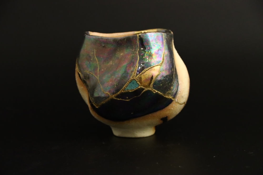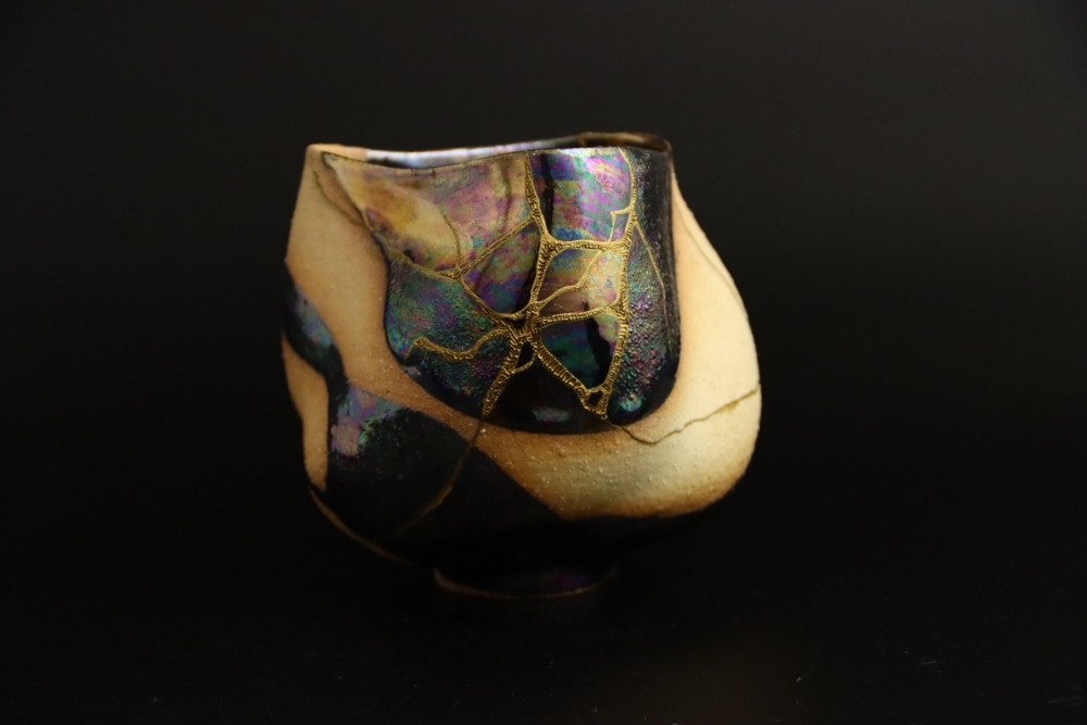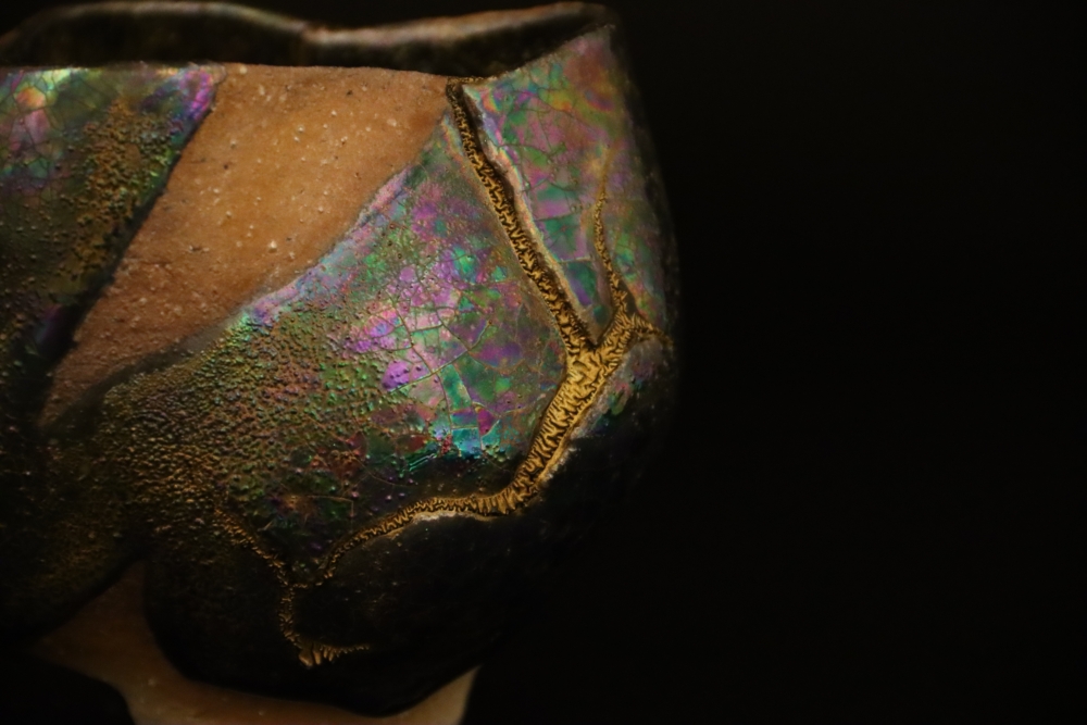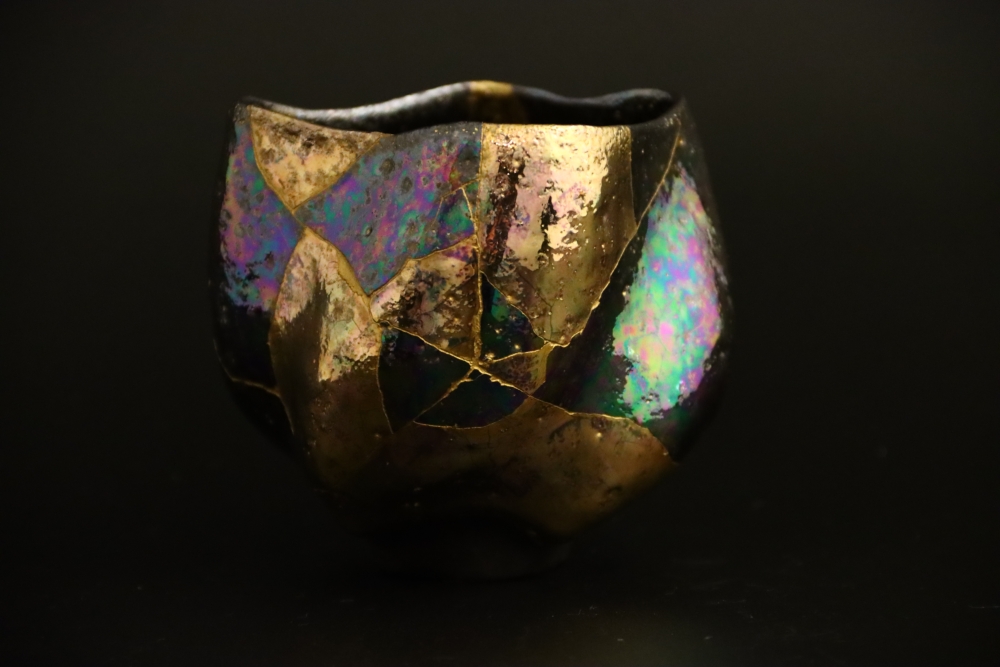 | 金継ぎ 抹茶茶碗 Kintsugi Teabowl 陶胎漆器:天然漆、純金仕上げ 呼び継ぎ:ギヤマン 1000$Sold 2021年12月制作 |