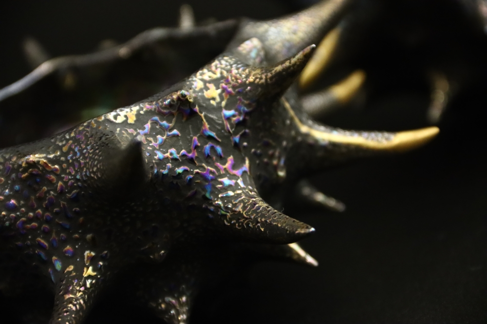 | 茶碗の割れた欠損部分に ![]() 自ら制作したギヤマン(吹きガラス)をカットし 呼び継ぎした 吹きガラスは Orion(オリオン座大星雲)をモチーフに吹いた |