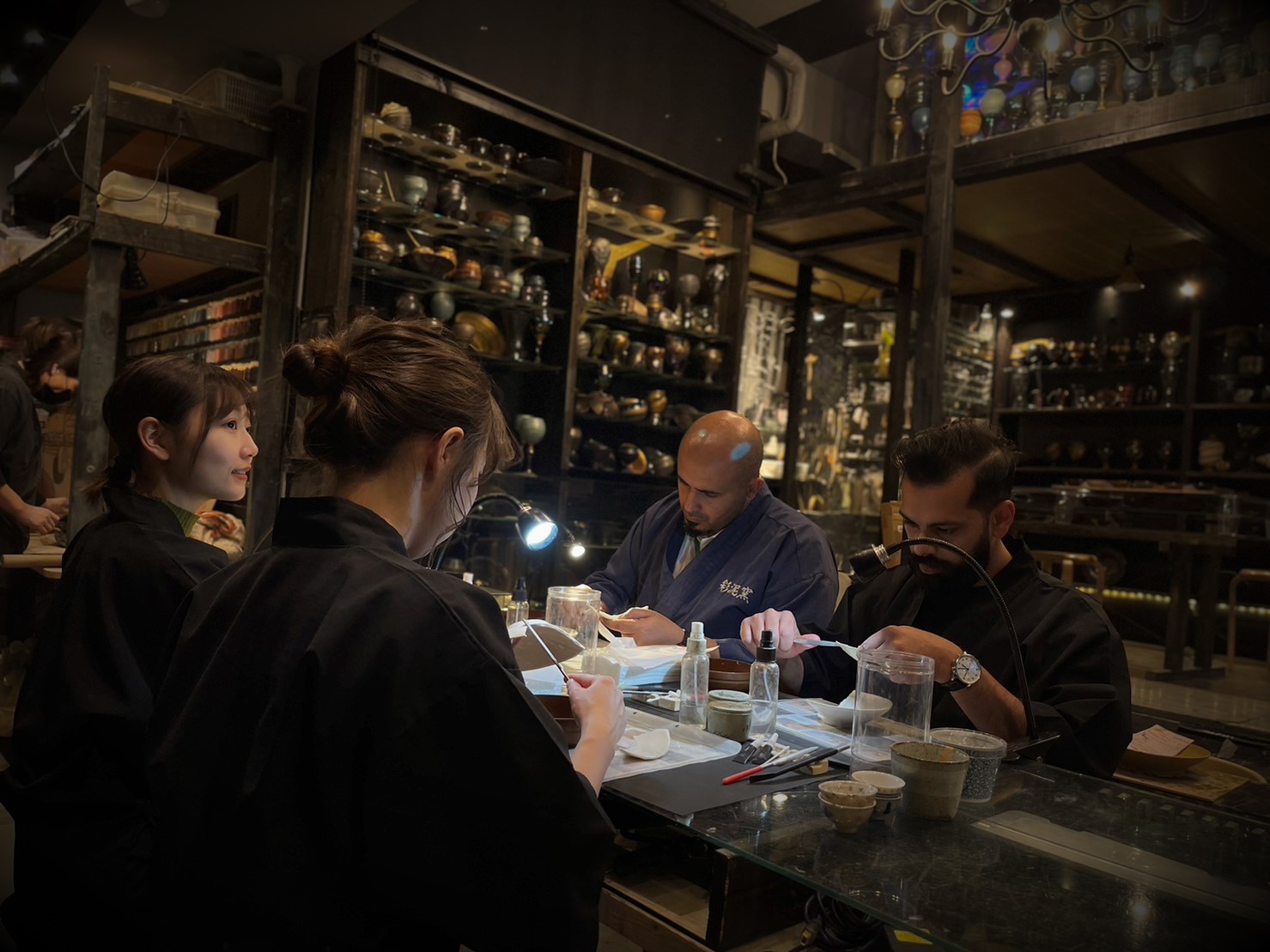 ![]() Option A: Wabi-Sabi Vermilion-Lacquer Crazing Kintsugi オプションA:侘び寂 朱漆貫入染め金継ぎ Overview|概要 Enhance the spirit of wabi-sabi by dyeing the natural crazing (fine cracks) of pottery with vermilion lacquer before applying kintsugi. This method reflects the Japanese view of life and impermanence through beauty in imperfection. 貫入(器の細かな亀裂)を朱漆で染め、侘び寂の精神を加えることで、 金継ぎとの相乗効果を生み出します。 日本人の生命観を映す、侘び寂を体感できる金継ぎ技法です。 Highlights|特徴 This workshop features original vessels handcrafted and fired by Taku Nakano, with careful attention to clay and glaze. Designed to help international guests intuitively experience the spirit of wabi-sabi, the process avoids traditional brushwork. Instead, participants gently polish the repaired surface to reveal delicate golden lines and subtle brilliance. With Nakano’s original urushi clay, even beginners can easily highlight beautiful kintsugi lines. All materials are 100% natural, using only pure gold and natural urushi lacquer. Finished pieces are safely packed in a custom protective box, making them easy to carry—even while traveling. このワークショップでは、中野拓が創作・焼成した特製の器を使用します。 土や釉薬にもこだわり、外国の方にも侘び寂の美意識が自然に伝わるよう設計されています。 筆は使わず、破断面をやさしく研ぐことで、繊細な金の線と輝きが浮かび上がります。 中野独自の漆粘土を使うことで、初心者でも簡単に美しい金継ぎ線を表現できます。 使用する素材はすべて天然で、純金と天然漆のみを使用。 完成した作品は、安全な専用ボックスに入れてお持ち帰りいただけるため、 旅行中の方にも安心です。 Additional Notes|補足 Participants will wear traditional Japanese workwear (samue) during the session. Gloves, sleeves, and protective clothing are provided to prevent skin contact with urushi. Please note: We cannot be held responsible in the rare event of an allergic reaction to urushi. 作業中は、和の作業着である作務衣を着用していただきます。 漆かぶれを防ぐため、手袋・スリーブ・作業着でしっかりと保護します。 ※万一かぶれた場合の責任は負いかねますので、あらかじめご了承ください。 Duration & Fee|所要時間・料金 The workshop lasts approximately 110 minutes and costs ¥22,000 per person, including all materials and instruction. It is available for groups of 1 to 20 participants and is suitable for ages 10 and up. 所要時間は約110分、受講料はお一人22,000円(材料費・指導料すべて込み)です。 1名から最大20名までご参加いただけます。対象年齢はおおよそ10歳以上です。 |