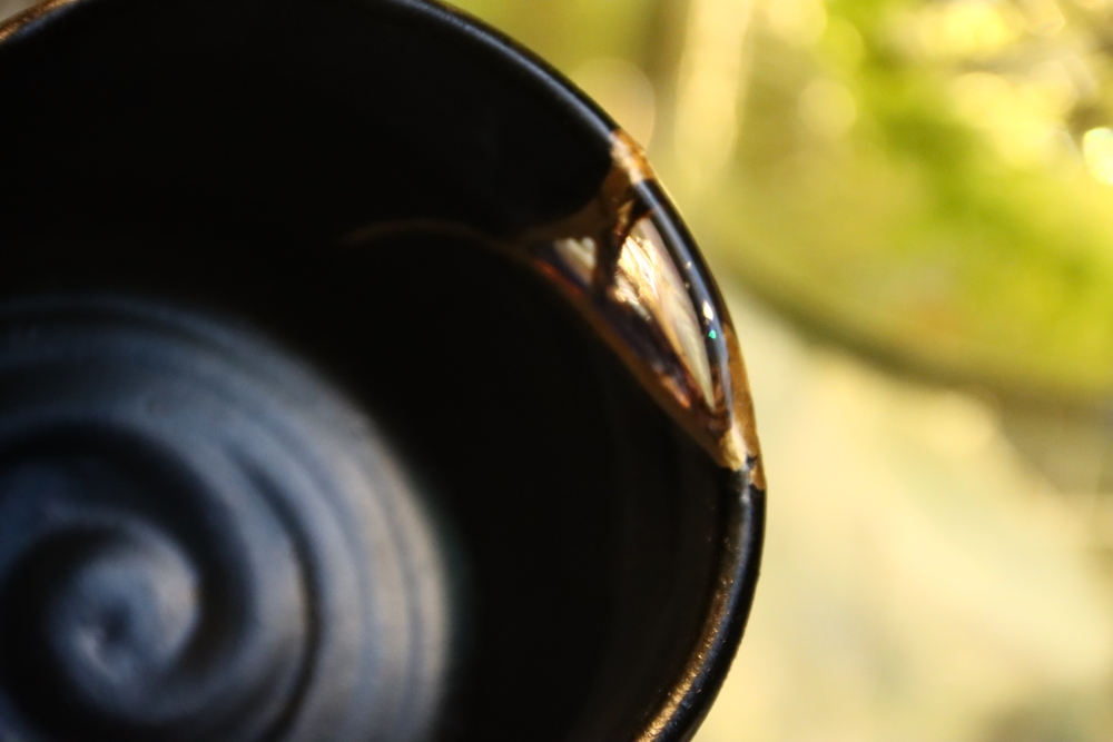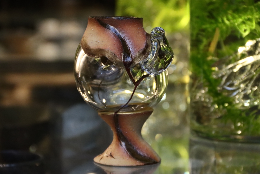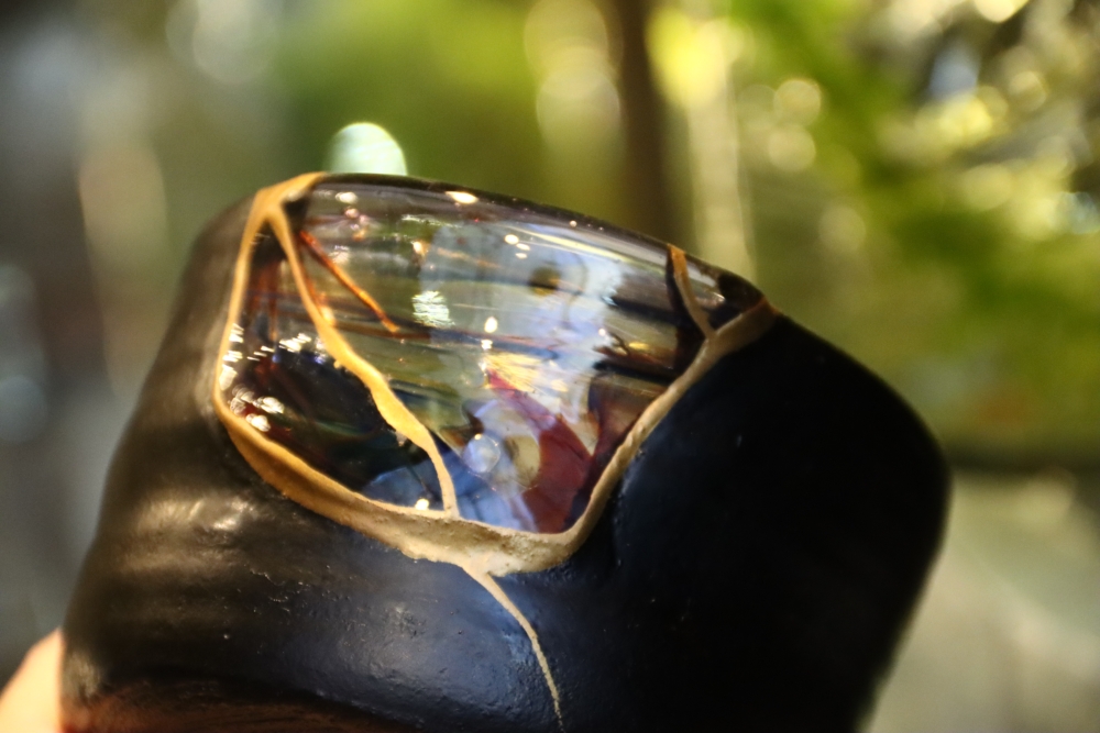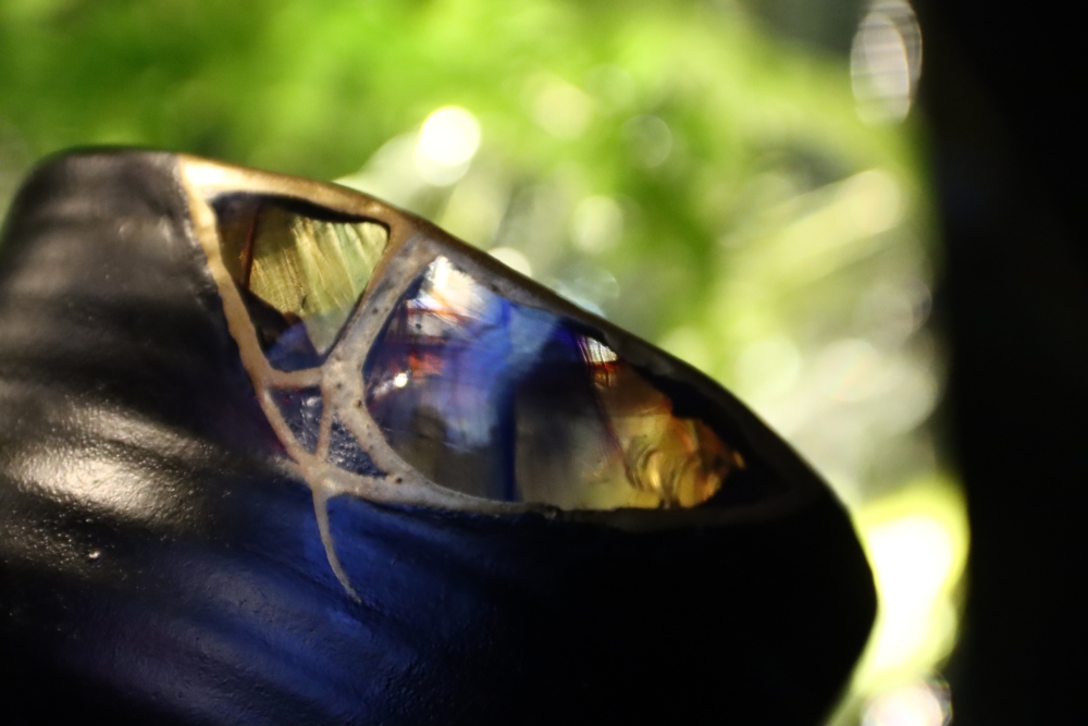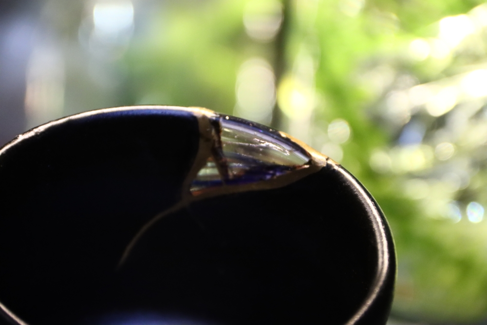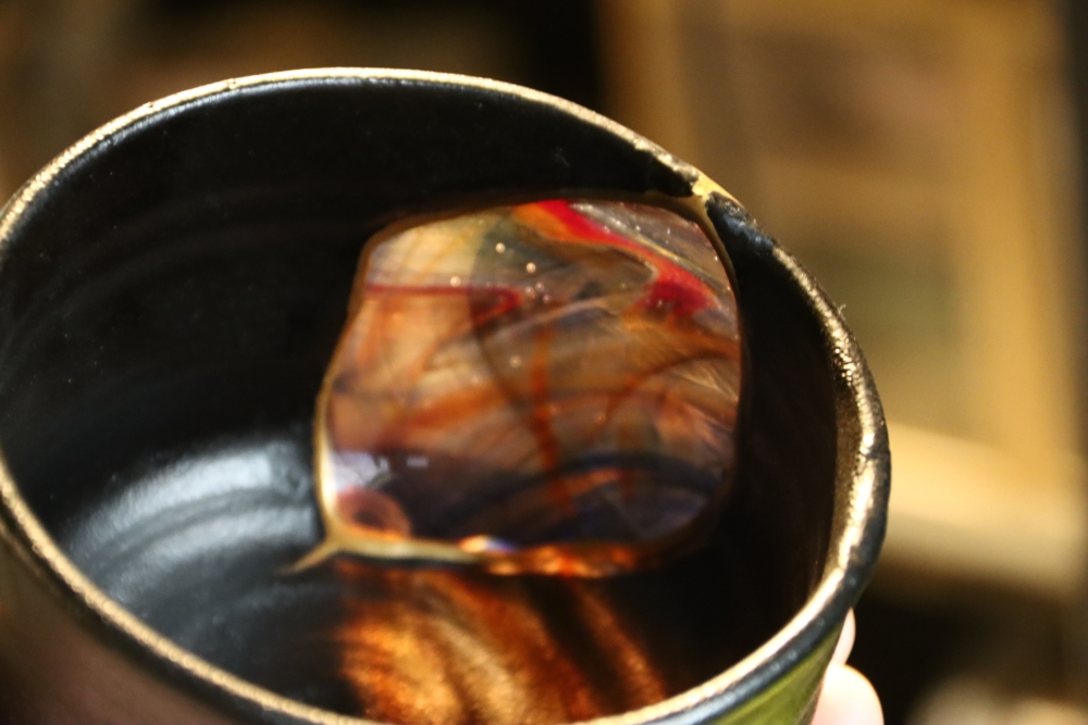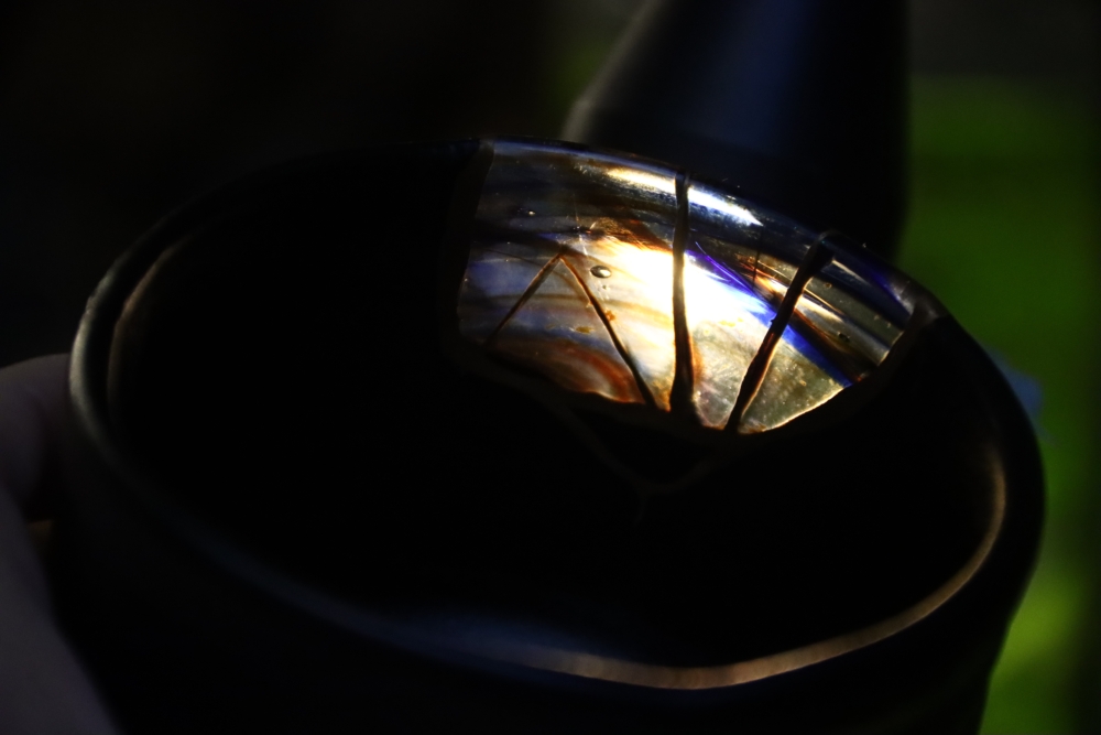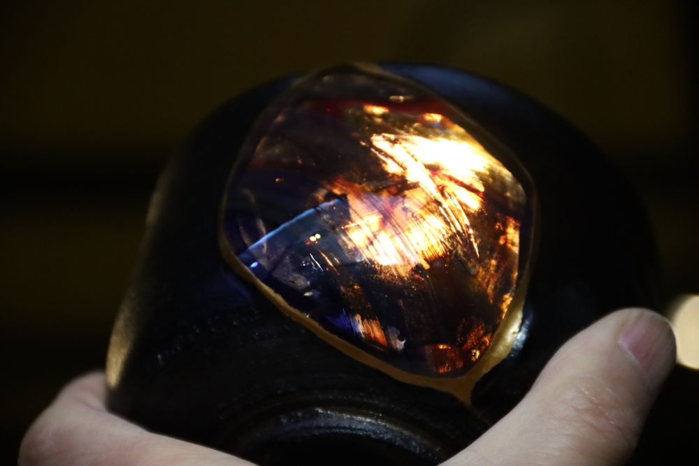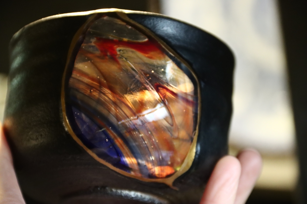 | 茶碗の割れた欠損部分に ![]() 自ら制作したギヤマン(吹きガラス)をカットし 呼び継ぎした 吹きガラスは Orion(オリオン座大星雲)をモチーフに吹いた |