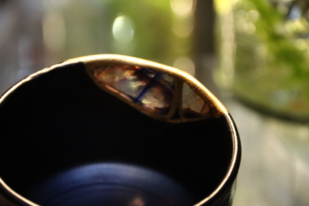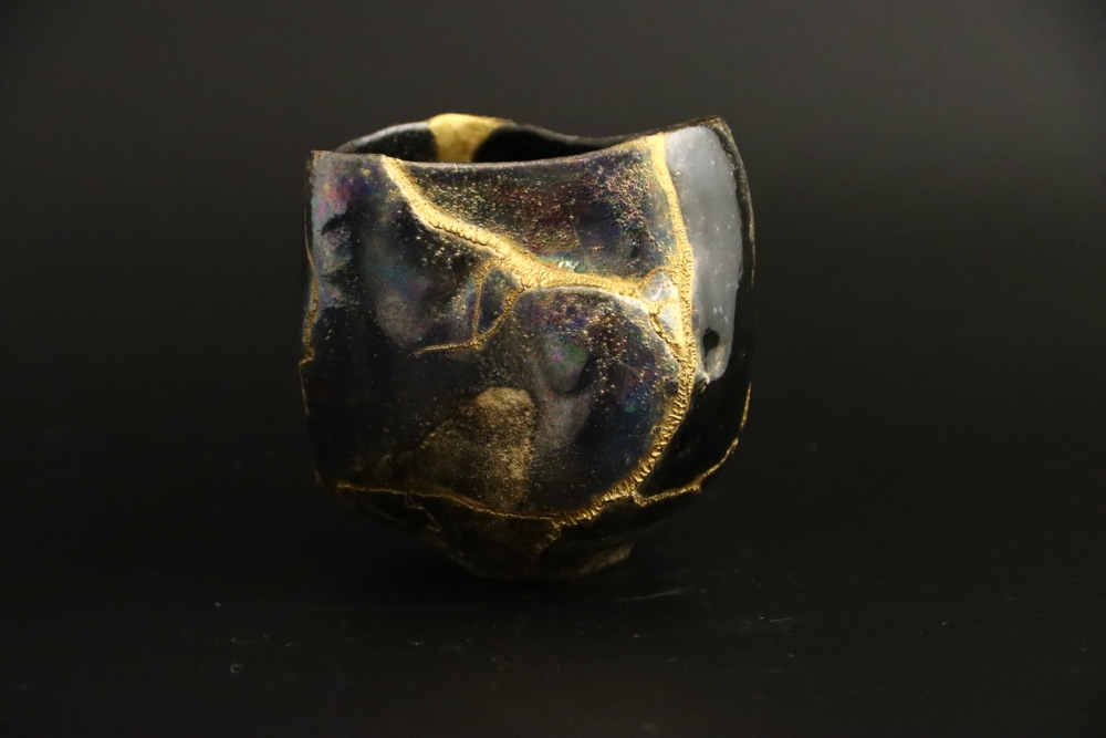 | 金継ぎ 抹茶茶碗 Kintsugi Teabowl 陶胎漆器:天然漆、純金仕上げ 呼び継ぎ:ギヤマン 1000$Sold 2021年12月制作 |