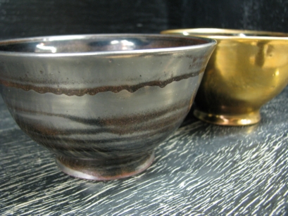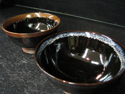 | 伝統の天目茶碗からインスパイア。二人の手作り生地を釉薬で包み、還元焼成で土と融合させた器。部分的に朱色に窯変した生地がしっとりとした肌合いと高級感を伝える。 |