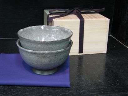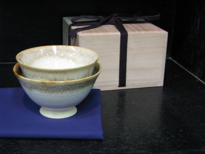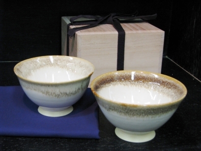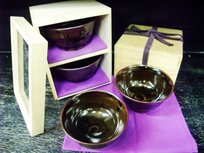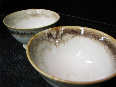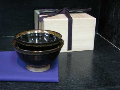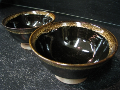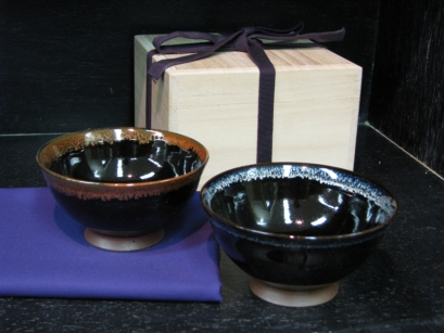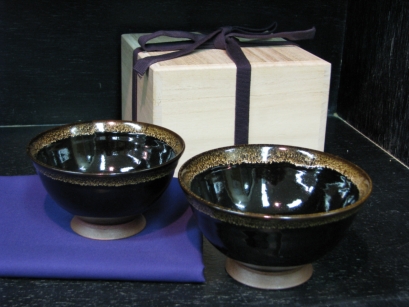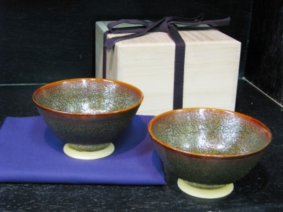 上と同じ天目飯椀です。口縁に夜空に浮かぶ紅葉を彷彿させる赤い釉薬を配しています。女性のように美しく、暖かい一品です。ご母堂さまへの贈呈にお勧めです。また、写真のように夫婦で色を変えるのも使い勝手がよく、心配りが高いと思います。