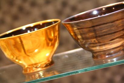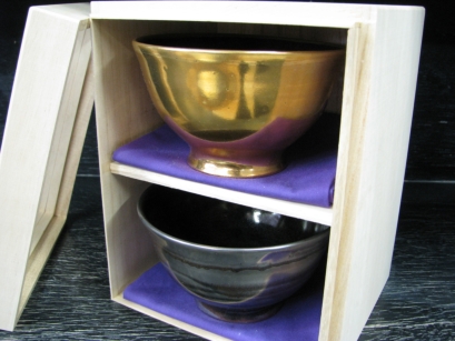 | 還元焼成で焼きあげた釉面に純金とプラチナを薄膜塗布し、三度にわたる焼成にて金と白金を焼き付けた最高級品。生涯の記念品として半永久的に輝きを放ちます。 |