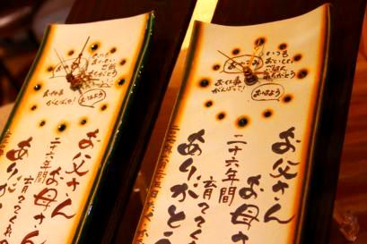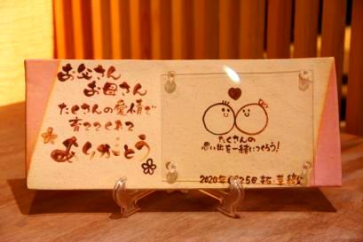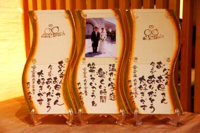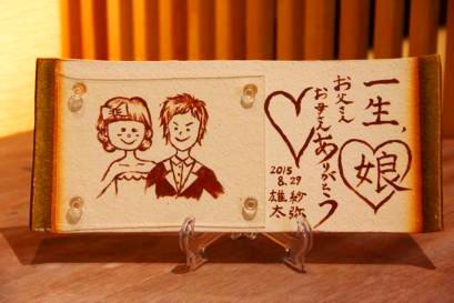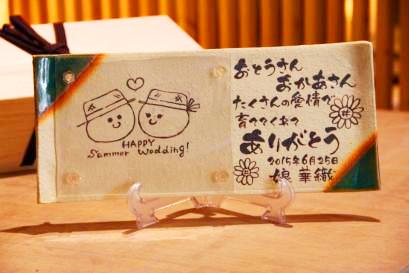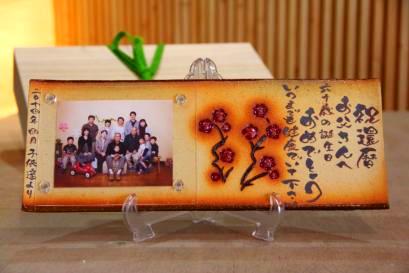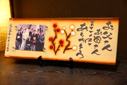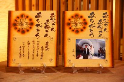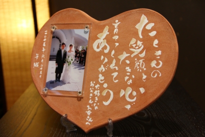 ![]() 若竹の内側をイメージした陶板。 和装婚にはぴったりのデザイン。 竹の子の皮のような茶色く焼いた桐の板もセット。 |