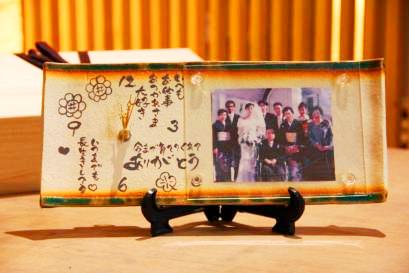 ■別途費用がかかるパーツ代 ・時計のムーブメント 12時間制:1650円 24時間制:3300円 ・フォトホルダー(アクリル板とネジ) 1650円 ・アップグレード!オーダー桐箱 2200円~5500円 (通常ラッピングに化粧箱や飾り用三脚などは付属します) ・梱包送料(ご両家分まで一か所につき) 3300円 (スタジオにてお引き取りの場合はかかりません) |