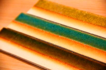 ![]() 揺らぐ炎をモチーフにした陽炎(ようえん) 焼き物らしい美しい緋色(ひいろ)は永久に色あせない。 右の新郎家と左の新婦家も繋がるように手作業でカットした。 |