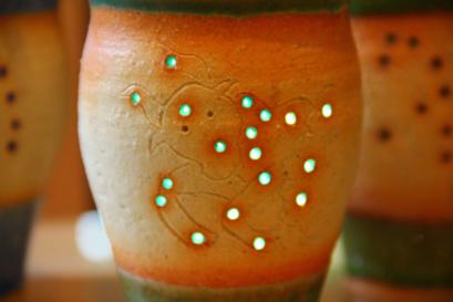 宇宙をモチーフに創作活動しているアーティスト、 拓さんがご家族へ贈るために考案したカップです。 お友達のお誕生日の星座を選んで、メッセージを入れて贈りましょう。 光を入れると輝く、自分の星座に、美しく輝く一年(一歳)を 連想してもらえることでしょう。 受講料 1回コース:板作り:6600円(1時間半くらい) 2回コース:電動ろくろ作り:11000円(合計2時間くらい) |